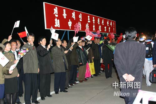 4月28日凌晨0時(shí)20分,載有北京奧運(yùn)圣火的“奧運(yùn)圣火號(hào)”平穩(wěn)地降落在平壤國(guó)際機(jī)場(chǎng)。朝鮮首都平壤是北京奧運(yùn)圣火海外傳遞“和諧之旅”的第18站。這是奧運(yùn)圣火自一九三六年開始傳遞活動(dòng)以來,首次來到朝鮮。圖為中國(guó)華人華僑在平壤歡迎奧運(yùn)圣火到來。沈晨 攝