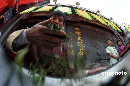 茶技師在北京老舍茶館門前炒制新鮮的大佛龍井春茶。中新社發(fā) 廖攀 攝