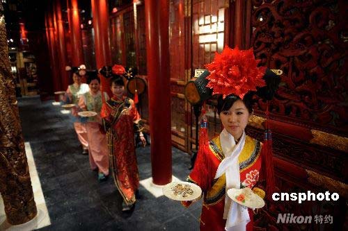 穿著“格格”服裝的服務員為北京老舍茶館新增設的小滿漢全席上菜,該席最高消費3000元每人。中新社發 廖攀 攝