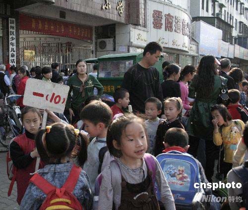 四月二十八日下午,阜陽市清河路小學一年級學生在排隊放學。安徽省阜陽市千余嬰幼兒童感染腸道病毒EV71后,當地政府正采取措施加強救治,嚴守預防,減少擴延。中新社發 張婭子 攝