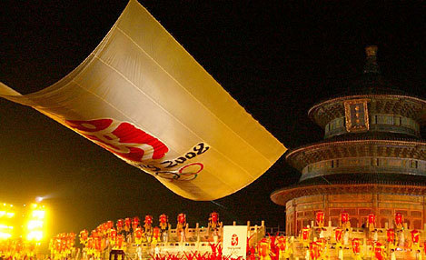 2003年8月3日,第29屆奧運會會徽“中國印·舞動的北京”發(fā)布儀式在北京天壇祈年殿舉行。(資料照片)