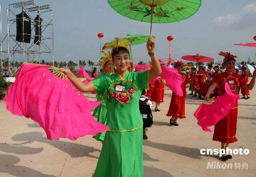 三亞民眾載歌載舞期待奧運圣火的到來。 中新社發(fā) 周兆軍 攝