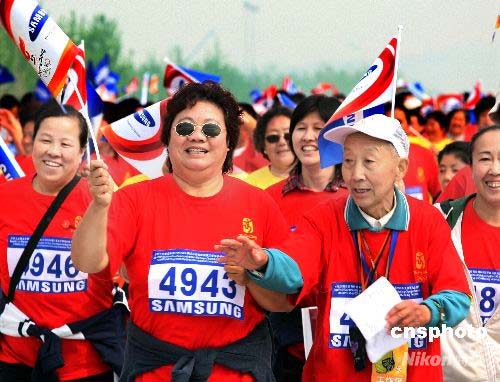 北京奧運(yùn)會(huì)倒計(jì)時(shí)100天群眾馬拉松接力活動(dòng)暨2008年北京國際長(zhǎng)跑節(jié),4月30日上午在北京國家體育場(chǎng)公共區(qū)隆重舉行。中新社發(fā) 宋吉河 攝