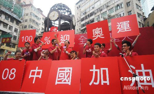 五月二日中午,香港特首曾蔭權出席時代廣場舉行的“全民迎圣火 中國加油”慶;顒樱c市民一起見證圣火在香港的傳遞。中新社發 蔡蔓莉 攝