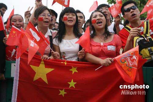 圖為澳門(mén)市民激情迎接奧運(yùn)圣火。中新社發(fā) 武仲林 攝