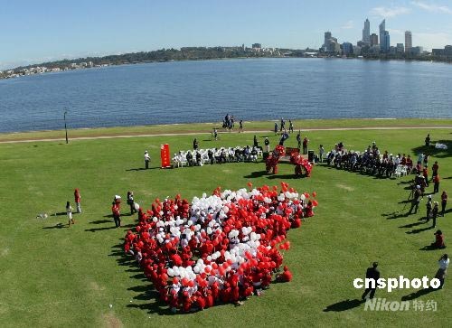 當地時間5月3日上午,三所西澳大利亞中文學校的二百多名7-14歲的孩子在西澳首府珀斯天鵝河畔,組成北京奧運會徽圖及澳大利亞地圖表達對北京奧運的支持。與此同時,13個西澳華人社團的代表向西澳參加北京奧運的運動員捐贈了五萬澳幣(近四十萬人民幣),表達西澳洲華人對澳大利亞體育事業的支持。 中新社發 高周丹 攝