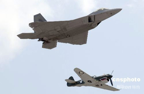 一架美軍最先進的F-22猛禽戰機與二戰時期的美軍戰機P-40空中共舞,讓人們體驗航空科技的突飛猛進。中新社發 張煒 攝