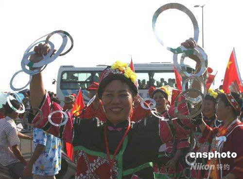 5月6日上午8時(shí)10分許,北京奧運(yùn)圣火在海南省海口市傳遞,這是圣火在海南傳遞的最后一站,數(shù)十萬(wàn)民眾走上街頭祝賀奧運(yùn)圣火在海口傳遞。圖為少數(shù)民族笑逐顏開迎接奧運(yùn)圣火。中新社發(fā) 尹海明 攝