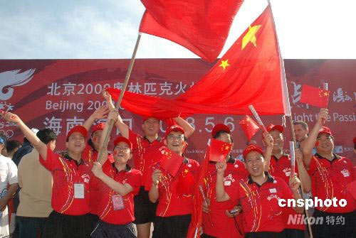 海口市民揮舞著國旗在起跑儀式上為奧運圣火順利傳遞吶喊助威。