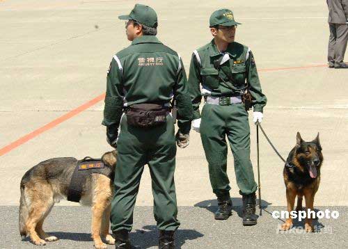 當(dāng)?shù)貢r(shí)間5月6日下午1點(diǎn)45分左右,中國(guó)國(guó)家主席胡錦濤乘專機(jī)抵達(dá)日本羽田機(jī)場(chǎng),開始對(duì)其為期5天的國(guó)事訪問。據(jù)日媒報(bào)道,日本政府動(dòng)用數(shù)千警力為此次的“暖春之旅”保駕護(hù)航。圖為在羽田機(jī)場(chǎng)執(zhí)勤的日警衛(wèi)人員與警犬。中新社發(fā) 朱沿華 攝