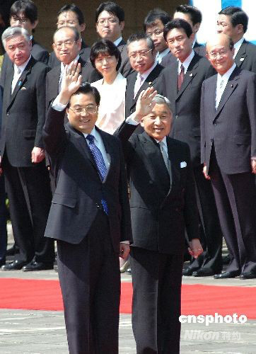 5月7日,正在日本進行國事訪問的中國國家主席胡錦濤及夫人出席了日本明仁天皇夫婦在皇宮舉行的歡迎儀式。中新社發 朱沿華 攝