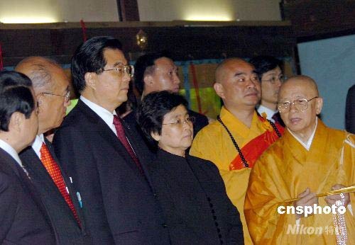 5月9日上午,胡錦濤及夫人劉永清在日本奈良冒雨參觀了著名的唐招提寺。圖為該寺長老在向胡錦濤夫婦介紹御影堂中陳列的日本國寶——鑒真和尚坐像。中新社發 朱沿華 攝