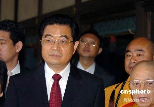 圖為胡錦濤在唐招提寺長老的陪同下參觀御影堂。中新社發(fā) 朱沿華 攝