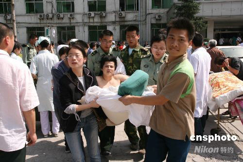 5月12日14點30左右,四川汶川發生7.8級地震,西安有震感,解放軍451醫院醫護人員緊急轉移傷病員,并迅速作出反應,搭設帳篷安置傷病員。中新社發 尤中原 攝