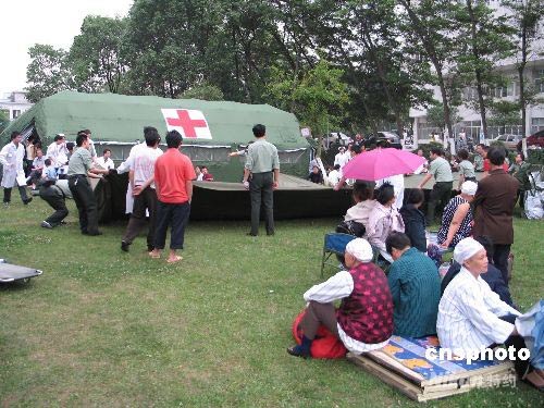 四川汶川縣發(fā)生7.8級地震。成都受到波及,也發(fā)生5.4級地震。位于成都北郊的成都軍區(qū)總醫(yī)院接收了來自地震災(zāi)區(qū)的100多名傷員。在積極組織搶救的同時,醫(yī)院搭建10余頂大型帳篷,將住院的1000多名患者全部安全轉(zhuǎn)移。中新社發(fā) 朱琥 攝