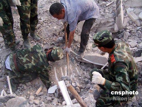 5月12日下午,四川汶川發生7.8級地震,導致重慶梁平縣文化鎮中心小學坍塌,武警重慶總隊梁平縣中隊官兵在中隊指導員唐兵的帶領下緊急趕赴現場展開搜救。經過官兵們連續6個小時的艱苦奮戰,從廢墟中成功救出11名師生。(李剛、陳萬金、秦龍兵攝影報道)