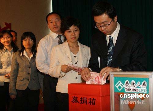 5月13日,北京各界向中國(guó)紅十字總會(huì)捐款,為地震災(zāi)區(qū)人民獻(xiàn)愛心。中新社發(fā) 燕平 攝