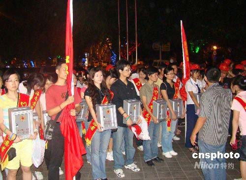 5月13日晚上八點,由海南青年志愿者協(xié)會、省紅十會、志愿海南愛心分社和海南電視臺《鷯哥》欄目組織30多位自愿者,走上街頭為四川地震災(zāi)區(qū)募捐善款。圖務(wù)志愿者作出發(fā)募捐前的準(zhǔn)備。中新社發(fā) 付美斌 攝