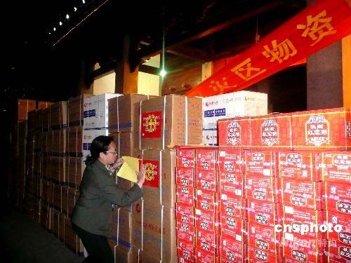 5月13日晚,揚州市紅十字會工作人員將收到的救災(zāi)款、救災(zāi)帳篷、醫(yī)療器械、藥品和食品連夜送赴四川地震災(zāi)區(qū),以最快速度把這些救災(zāi)款、物轉(zhuǎn)交給災(zāi)區(qū)人民。圖為揚州市紅十字會工作人員在救災(zāi)物資上貼“愛心”標(biāo)志。中新社發(fā) 崔佳明 攝