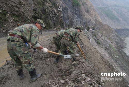 武警在搶修到汶川縣映秀鎮的公路。中新社發 郭國權 攝