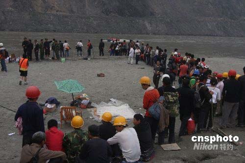 汶川縣映秀鎮(zhèn)等災(zāi)區(qū)群眾經(jīng)過幾天的跋涉,走到安全地帶等待運(yùn)往災(zāi)民安置點(diǎn)。中新社發(fā) 郭國權(quán) 攝