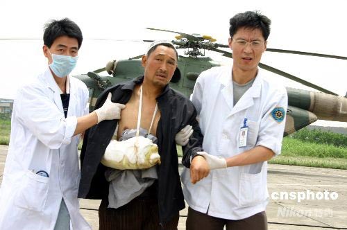 5月18日11時35分,一架軍用直升機載著11名臺灣游客,從四川汶川起飛,于12時許平安抵達成都鳳凰山機場。他們是臺灣祥鶴旅行社14人游客團中脫困的首批游客,另3人將于下午搭乘另一架直升機脫離險境。圖為救護人員攙扶臺灣游客上車。中新社發 楊杰 攝