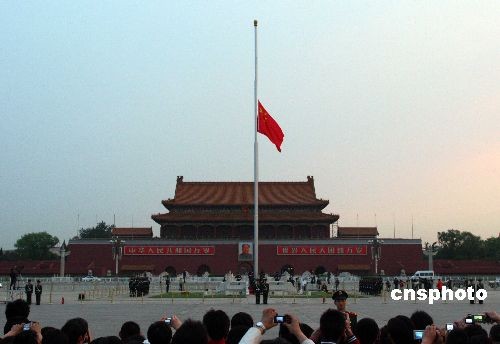 5月19日清晨,北京天安門廣場下半旗,哀悼5·12汶川大地震中遇難同胞。中國國務(wù)院作出決定,5月19日至21日為全國哀悼日。在此期間,全國和各駐外機(jī)構(gòu)下半旗志哀,停止公共娛樂活動,中國外交部和中國駐外使領(lǐng)館設(shè)立吊唁簿。5月19日14時28分起,全國人民默哀3分鐘,屆時汽車、火車、艦船鳴笛,防空警報鳴響。 中新社發(fā) 富田 攝
