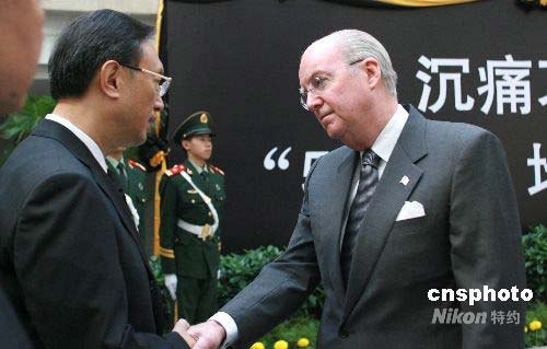 美國駐華大使雷德(右)前往吊唁時,與中國外交部部長楊潔篪握手,表示美方將增加對華救災(zāi)援助。中新社發(fā) 廖文靜 攝
