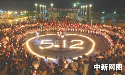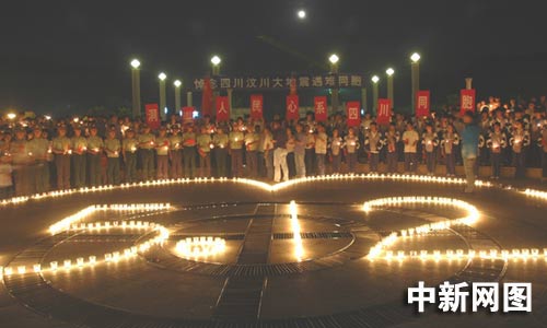 5月20日是全國哀悼日三天中的第二天,在浙江溫州市百島洞頭新城廣場上,洞頭縣消防大隊的官兵們點燃祭奠逝者的燭臺,擺放成含有5月12日標志的心型,讓5月12日不幸遇難的同胞以及為了災區安危舍身救人的消防官兵,為中國所銘記。哀傷的氣氛在廣場彌漫,廣場上的人們默默地守護著自己手中的燭光,低頭默哀,他們希望通過這種方式將地震遇難同胞通往天堂的路照亮,將受災地區抗災自救的路照亮。(江耘 林加佳 林加杰)