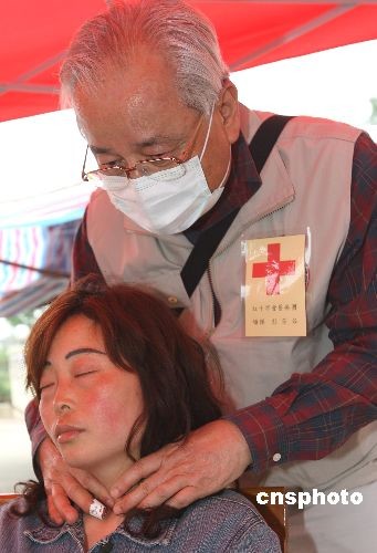 5月21日下午,臺(tái)灣紅十字醫(yī)療隊(duì)在四川省廣漢市高坪鎮(zhèn)災(zāi)民安置中心安營(yíng)扎寨開展醫(yī)療救治。78歲的原臺(tái)北市醫(yī)師工會(huì)理事長(zhǎng)彭芳谷先生在高坪鎮(zhèn)中心醫(yī)院緊急搶救一名在地震中受重傷產(chǎn)生“氣胸”的中年女患者,并指導(dǎo)醫(yī)療隊(duì)醫(yī)生為期實(shí)施外科手術(shù)。中新社發(fā) 任晨鳴 攝