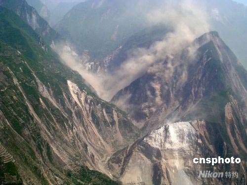 五月二十三日是汶川大地震第十二天,震中區的高山上依然不斷發生山體滑坡,泥石滾滾,煙霧騰騰。中新社發 劉小青 攝