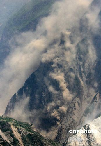 五月二十三日是汶川大地震第十二天,震中區的高山上依然不斷發生山體滑坡,泥石滾滾,煙霧騰騰。中新社發 賈國榮 攝