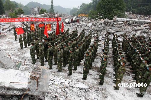 救災(zāi)解放軍士兵火線加入中國共產(chǎn)黨。中新社發(fā) 曾憲平 攝