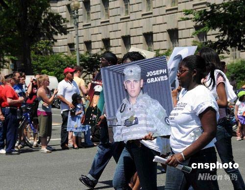 一些反戰(zhàn)組織也舉行了反戰(zhàn)示威,他們高舉在伊拉克戰(zhàn)場(chǎng)上陣亡的士兵畫像,要求布什政府盡快撤軍。中新社發(fā) 邱江波 攝