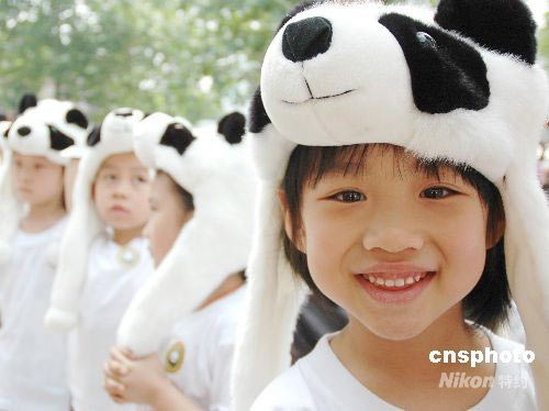 圖:小朋友戴熊貓頭套扮可愛(ài)