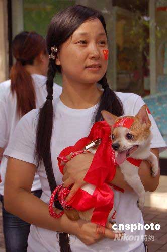 一名女孩帶著一身披紅的寵物小狗在街頭等待奧運圣火到來。中新社發 劉萬強 攝