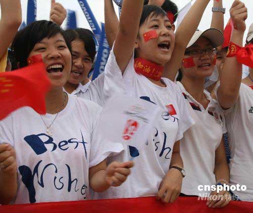 當地民眾沿途熱情為火炬手、北京奧運會加油。中新社發 林艷華 攝