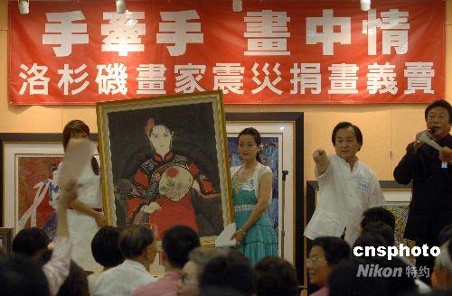 當地時間六月七日下午,洛杉磯地區旅美畫家賑災捐畫義賣活動在阿罕布拉市舉行,近百名旅美畫家為中國地震災區捐獻了數百幅作品,當地數百名藝術品收藏家和愛好者參加了義賣活動。最終,百分之九十以上的畫作被成功拍賣,總成交約二十萬美元。中新社發 張煒 攝