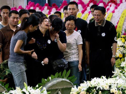 6月13日,四川大地震救援中失事直升機遇難機組人員遺體告別儀式在成都市殯儀館舉行,來自軍方及社會各界的人士紛紛前來送別英雄。圖為遇難機組人員家屬悲痛欲絕送別親人。中新社發 劉新 攝