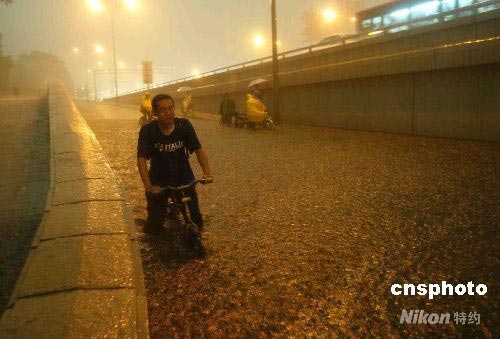 6月13日下午5時許,強雷陣雨突襲京城,北京市氣象臺發布了雷電黃色預警信號。 圖為在北京一橋下積水路段,民眾“河”中推車。中新社發 富田 攝