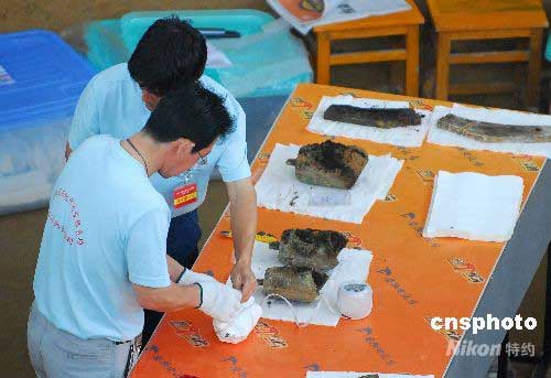 考古人員在對提取上來的青銅器進行簡單處理。中新社發 從啟 攝