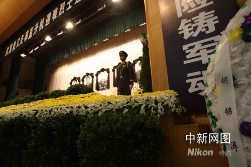 6月16日上午十時,成都軍區隆重舉行某集團軍陸航團直升機組邱光華、李月、王懷遠、陳林、張鵬5位烈士追悼會。5月31日,他們在執行運送受災群眾任務中,因高山峽谷局部氣候瞬時變化、突遇低云大霧和強氣流不幸失事而光榮犧牲。中華人民共和國中央軍事委員會主席胡錦濤6月14日簽署命令,授予他們所在的陸航團“抗震救災英雄陸航團”榮譽稱號。中新社記者 賈國榮 攝