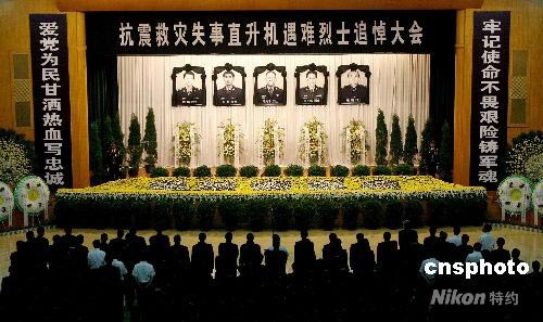 6月16日,在四川汶川大地震中執(zhí)行救援任務(wù)失事直升機(jī)組遇難烈士追悼大會(huì)在成都舉行,中共中央總書(shū)記、國(guó)家主席、中央軍委主席胡錦濤,中央軍委、總參謀部、總政治部等分別向邱光華、李月、王懷遠(yuǎn)、陳林、張鵬五位烈士敬獻(xiàn)花圈。四川省黨、政、軍等社會(huì)各界前來(lái)吊唁。