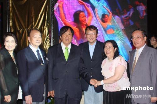 臺灣“立委”周守訓(右三)前來向《明報》企業集團董事主席張曉卿(左三)表示祝賀。中新社發 耿軍 攝