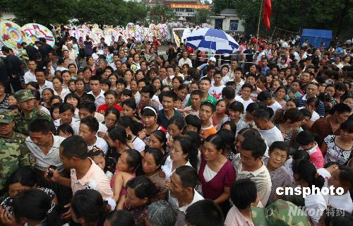 汶川地震災區四川都江堰市胥家鎮,在抗震救災中犧牲的武文斌的簡易靈堂前擠滿了數萬前來悼念的民眾。中新社發 曾憲平 攝