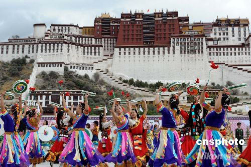 圖:藏族民眾布達拉宮廣場歡慶奧運火炬?zhèn)鬟f