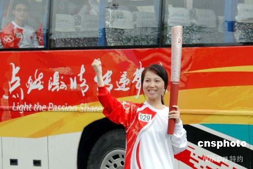 6月21日,奧運火炬在西藏拉薩進行傳遞,火炬手秦莉手持火炬興奮異常。中新社發 周波 攝