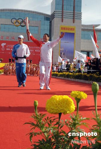 申請藏羚羊為奧運吉祥物的青海可可西里國家級自然保護區管理局局長才嘎為第一棒火炬手。中新社發 廖攀 攝