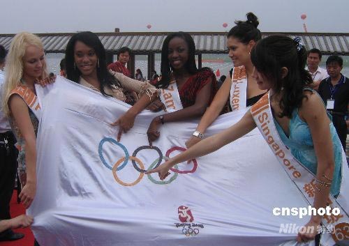 6月23日,參加一年一度世界休閑小姐總決賽的佳麗們來到蘇州中國(guó)珍珠寶石城舉行巡游活動(dòng)。在珍珠湖畔,佳麗們親手穿線串珠,共同制作了由20888顆淡水珍珠匯成的奧運(yùn)五環(huán)旗,并奉上“預(yù)祝2008北京奧運(yùn)會(huì)舉辦成功”的美好祝愿。 中新社發(fā) 黃瑩 攝
