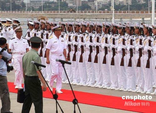 圖為日本海上自衛隊第四護衛隊群司令德丸伸一少將,在中國人民解放軍南海艦隊司令蘇士亮陪同下檢閱中國人民解放軍海軍儀仗隊。中新社發 宋吉河 攝